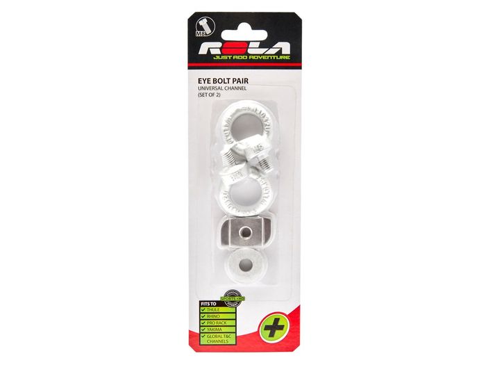 If you need an easier way of securing loads on your Rola Roof Rack or global narrow T-Channel equipped roof rack, these Rola Eye Bolts are design specifically for you. Manufactured from solid steel and zinc coated these eye bolts will be resistant to corrosion and abrasion damage and are super quick and easy to install. Simply slip the end cover of your roof rack off, slide in the square channel nut and slide along to where you require. Then with the large washer located on the eye bolt, screw it into the nut. Should you find the eye bolt sits at an inconvenient angle, loosen and slip the assembly out of the channel, rotate the nut 90 degrees and reinstall. You now have an adjustable tie down point capable of comfortably supporting your roof load limit. These stainless steel channel eye bolts are suitable for most types and brands of roof racks that have a T or C channel. Weight - 0.15kg. 5 years.