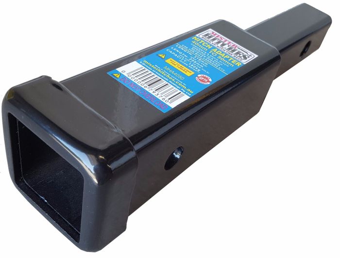 Mister Hitches Hitch Adapter 40mm To 50mm · CONVERTS AN 40MM HITCH INTO A 50MM SQ. RECEIVER SUITABLE FOR ACCEPTING BIKE CARRIERS AND OTHER RECEIVER MOUNT ACCESSORIES · TOTAL LENGTH = 319MM LENGTH PIN HOLE TO PIN HOLE = 208MM CAPACITY = 180KG DOWN WEIGHT CAPACITY · MADE FROM POWDER COATED HIGH GRADE STEEL NOTE: NOT FOR TOWING