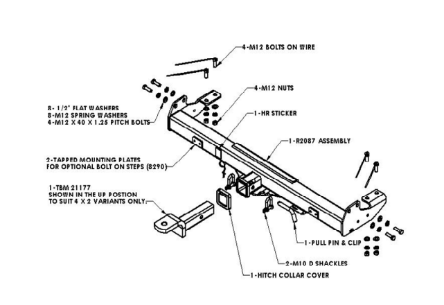 HAYMAN REESE CLASS 4 TOWBAR Vehicle: TOYOTA HILUX 4X2 Year: 04/2005-09/2015 Ball Mount: 50x50 REMOVABLE Towbar Rating: 2500KG Ball Weight: 250KG Body: 4D UTE NOTES: ALL 2WD VARIANTS WITH NO FACTORY BUMPER/STEP. ***7 PIN FLAT TRAILER PLUG INCLUDED***